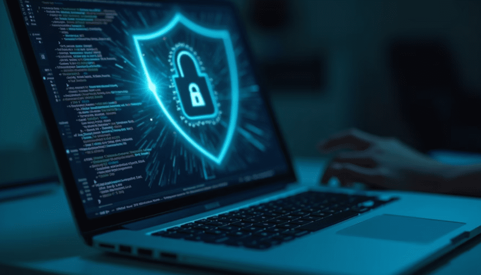 A laptop keyboard with a shield icon representing computer protection
