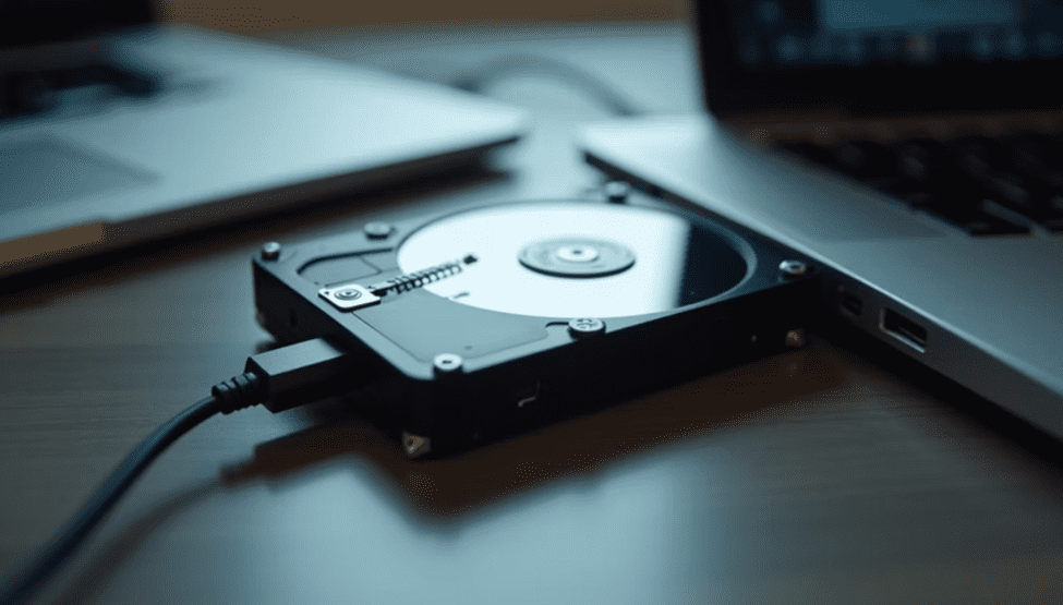 External hard drive connected to a laptop for backing up important files